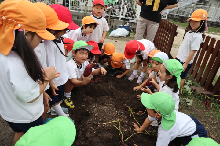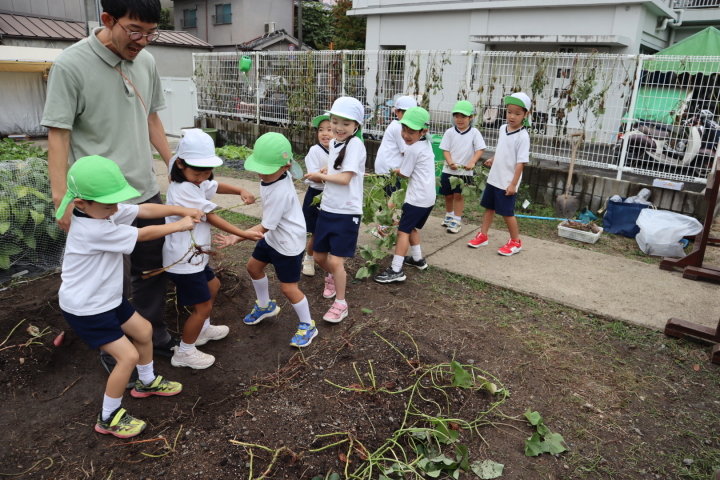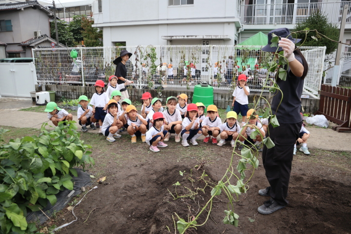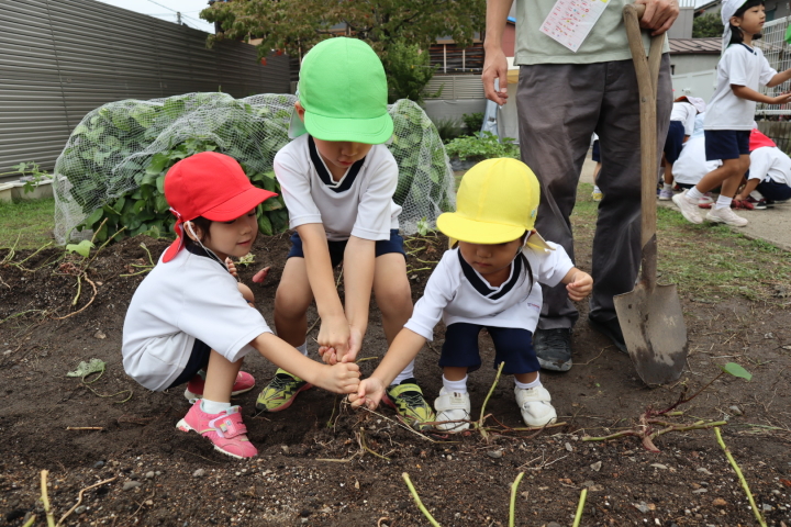今日も良いお天気でしたね。畑ではほし組の子ども達が、お芋掘りを楽しむ姿が見られました。担任がお芋の頭が少し見えるところまで掘り進めておき、続きを子ども達が掘りました。子どもサイズの可愛いお芋がいくつか掘れましたよ。嬉しそうにお芋を持ち歩く子や、探索活動を楽しむ子、石を集める子等思い思いの遊びを楽しんでいましたが一番人気があったのは、長ーいお芋のツルをお友達と一緒に持って畑の中をぐるぐる歩き回る事でした。一昨日はぶどう組が、これから残りのクラスがお芋掘りを行います。