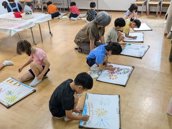 画用紙を半分に折り、片方の面のみにスプーンで絵具を置いてゆきます。上から押さえて開いてみると、色が重なり合って新しい色が生まれたり、見たこともない形が現れて印象は大きく変わっていました。子ども達は、鳥や魚、トンネル等、色々な物に見立ててお話を楽しんでいましたよ。
