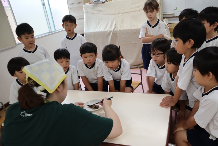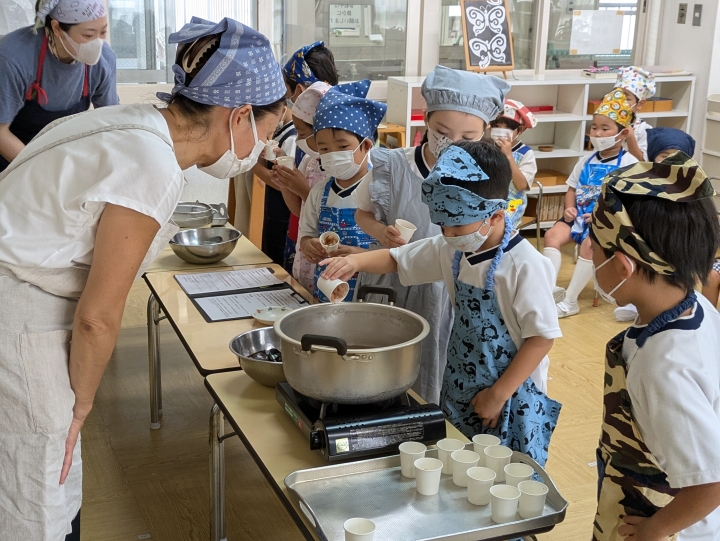 今日はA組さんが初めてのクッキング。真新しいエプロンを付けて集合しました。出汁を作る前に用具や素材の説明を聞き、昆布を触ったり、匂いを嗅いだり、煮干しを試食しましたよ。そして、こんぶ、煮干しをお湯の中に投入。最後にかつお節をいれて出汁が完成しました。その間にも 出汁の良いにおいが部屋中に漂い、お鍋の中はどのように変化しているか、子ども達の期待が膨らむ中、出汁が出来上がりました。