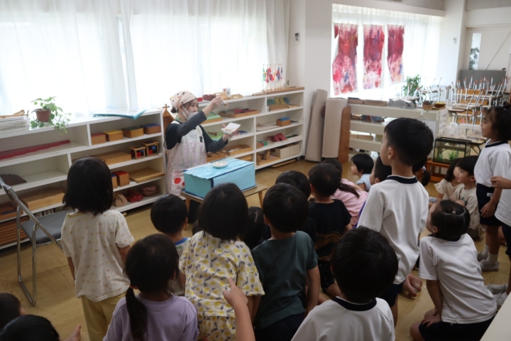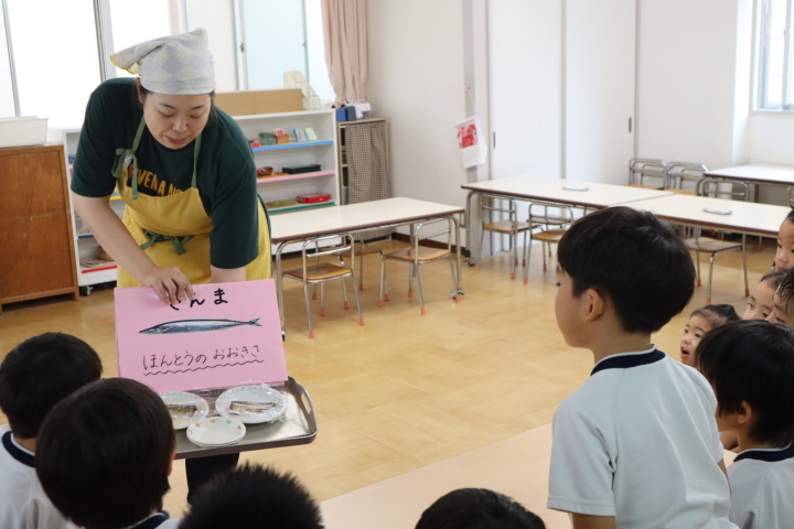 毎月一回、給食の職員から各クラスへお話の機会があります。毎回食べ物と身体の関係等々、工夫をこらし子ども達も興味を持って聞いています。どんなお話だったか、是非お子さんに聞いてみてください。