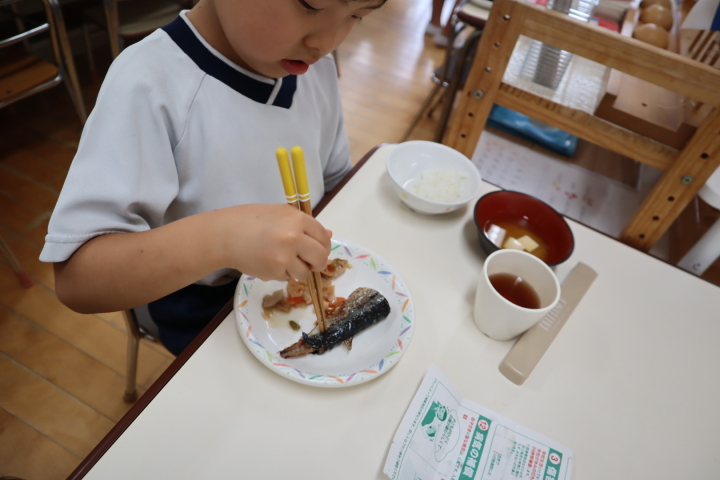 今日は給食で秋刀魚を食べました。BCD組は給食室で骨取りをしました。