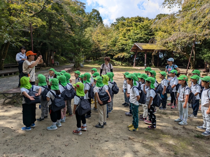 八瀬野外保育センターへ行きました。6月に来た時のことを「前は~だったね。」とよく覚えている子どもたち。季節も変わり、また新しい自然物との出会いがたくさんありました。(かまきり・バッタ・ヒガンバナ・クロモジの実・ほうの木の実・かぶとむしの幼虫、等々…)山の斜面を登ったり下りたり、たくさん歩きました。